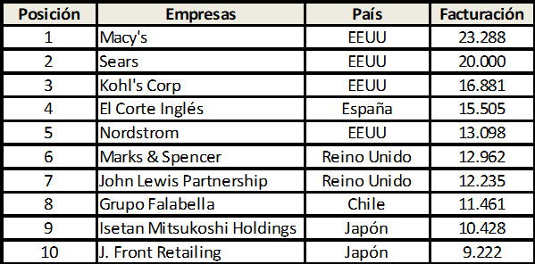TOP TEN GRANDES ALMACENES POR VOLUMEN DE FACTURACIÓN EN 2016